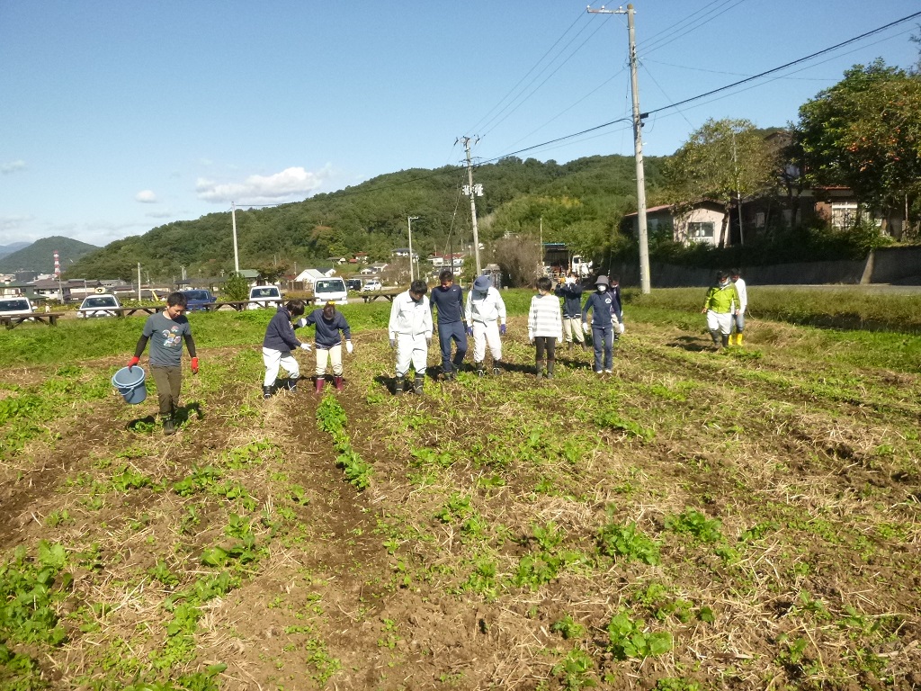今年は渡利地区ふくしま共創のまちづくり懇談会の方6名、花見山菜の花畑プロジェクトサポートメンバーの方3名、地元渡利中学校の生徒45名のボランティアと一緒に行いました。みんな元気いっぱい、満面の笑みで気持ちを込めて約40aの畑に蒔きました。