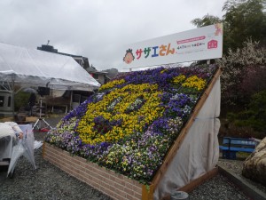 人気アニメ「サザエさん」をデザインした花壇が、花見山公園入口前に設けられ、4月3日に除幕式が行われました。